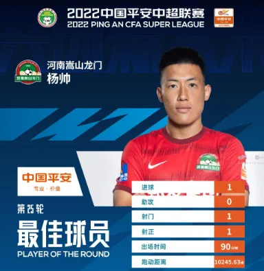 虎扑11月15日讯 据中超联赛官方的消息,在2022中国平安中超联赛第25轮最佳球员评选中,河南嵩山龙门球员杨帅在比赛中凌空侧勾进球,助力队伍实现比分反超,这也是他个人中超生涯第100次出场。