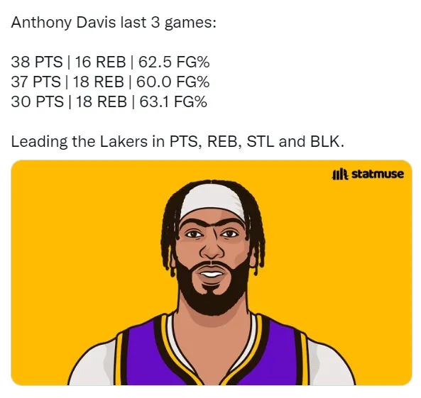 虎扑11月21日讯 过去三场比赛,安东尼-戴维斯的数据如下: