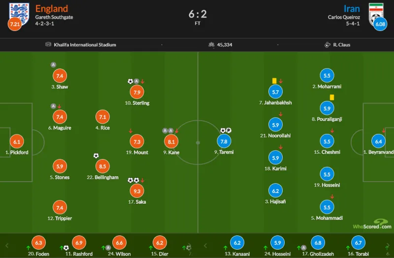 虎扑11月21日讯 北京时间11月21日21:00,世界杯B组小组赛在哈利法国际体育场打响,英格兰对阵伊朗。上半场,贝兰万德伤退,马奎尔头球中框,卢克-肖助攻贝林厄姆头球破门首开记录,马奎尔头球摆渡助攻萨卡凌空撩射破门,补时阶段凯恩传中助攻斯特林扩大领先;下半场,斯特林助攻萨卡破门完成梅开二度,随后塔雷米爆射破门扳回一球,拉什福德替补登场不到一分钟接凯恩传球第一次触球即完成破门,威尔逊倒三角助攻格拉利什推射空门锦上添花,补时阶段最后时刻斯通斯送点、塔雷米主罚点球破门完成双响。最终,英格兰6-2战胜了伊朗取得开门红。