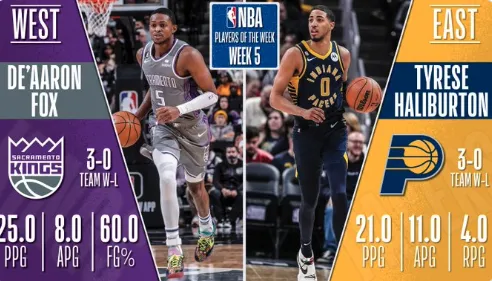 虎扑11月22日讯 今日联盟官方公布上周东西部周最佳球员,国王后卫达龙-福克斯和步行者后卫泰雷斯-哈利伯顿分别当选。
