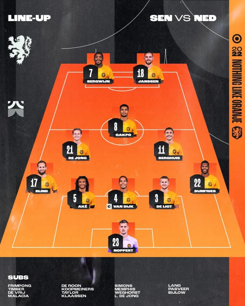 荷兰首发:23-诺普特、3-德里赫特、4-范戴克、5-阿克、11-博古伊斯、17-布林德、21-弗兰基-德容、22-邓弗里斯、7-贝尔温、8-加克波、18-文森特-延森