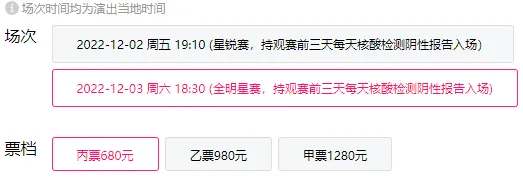 星锐赛门票分三档:丙票480元、乙票680元、甲票980元。
