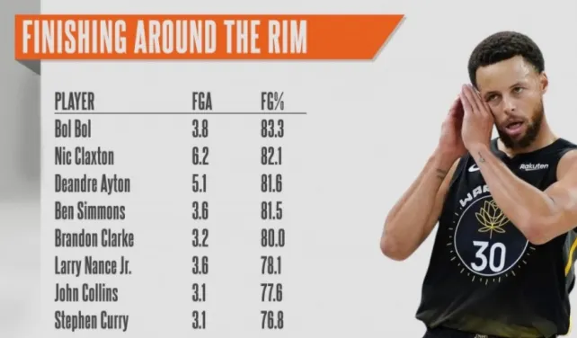 虎扑11月28日讯 美媒SplashBrosMuse统计了本赛季至今,篮下终结命中率前8球员,而斯蒂芬-库里排名第8,他的篮下终结命中率达到76.8%。
