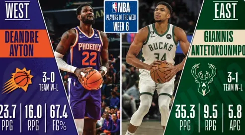 虎扑11月29日讯 今日联盟官方公布上周东西部周最佳球员,太阳中锋德安德烈-艾顿和雄鹿前锋扬尼斯-阿德托昆博分别当选。