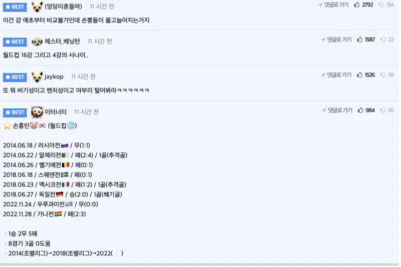 ——孙兴慜(小丑表情),国家队世界杯战绩为1胜2平5负,八场比赛3进球0助攻。2014年小组赛、2018年小组赛、2022(?)。