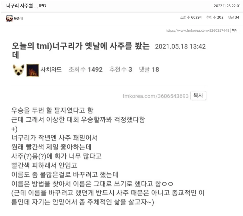 Nuguri的算命趣闻:据说是夺冠两次的八字,所以很害怕自己会获得很奇怪的比赛的冠军。Nuguri去年很相信算命,本来挺喜欢红色的,算命先生说他内心有很多火气,让他避开红色,所以就不穿红色了。本来名字也想改成含“水”的字的,但是找到方法解决了名字的问题,就继续用原来的名字了。
