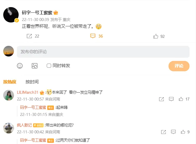记者鲁蜜更新微博写道:“正看世界杯呢,听说又一位被带走了。”