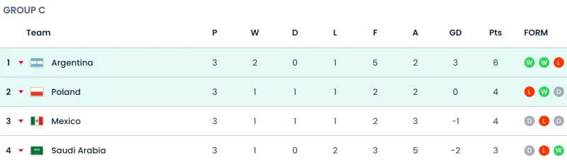 虎扑12月01日讯 世界杯小组赛C组的比赛已经全部结束,阿根廷头名晋级,波兰第二出线,墨西哥、沙特阿拉伯出局。