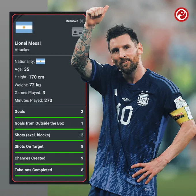 虎扑12月01日讯 北京时间今天凌晨结束的世界杯C组的比赛,阿根廷与波兰携手出线。国外媒体Squawka统计了梅西在小组赛中的数据,在参与进球、射门次数、射正次数、创造机会次数和对方禁区内触球次数这几个方面,梅西都是最多的。