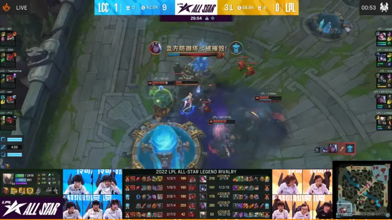 4分钟,双方中野2V2,LCC下路组合率先支援,将阿卡丽击杀。