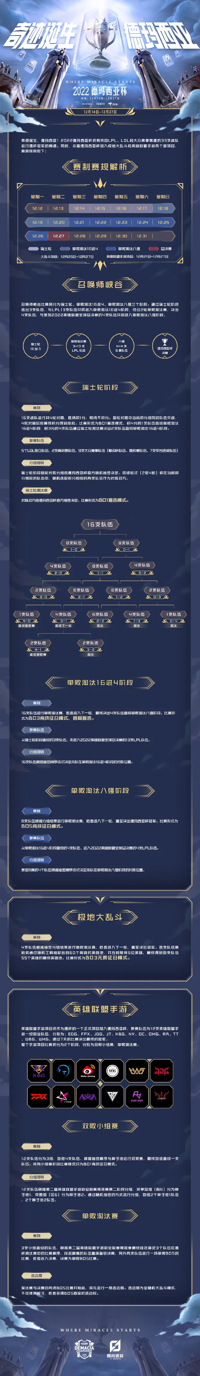 奇迹诞生,德玛西亚!2022德玛西亚杯将于12月14日-12月27日举行。来自LPL、LDL和大众赛事渠道的33支战队进行德杯冠军的角逐,全民参与和多元化融合,各赛道队伍将在这个舞台上展现出自己的风采。同时,本届德玛西亚杯加入极地大乱斗和英雄联盟手游两个新项目。