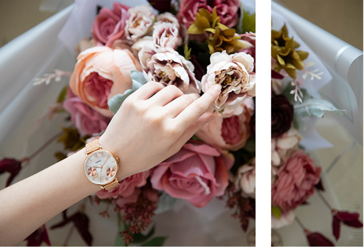 外形外观:表外部电镀一层金黄色,可以很好的保护表体不被伤害。表盘手绘花朵,令人耳目一新。