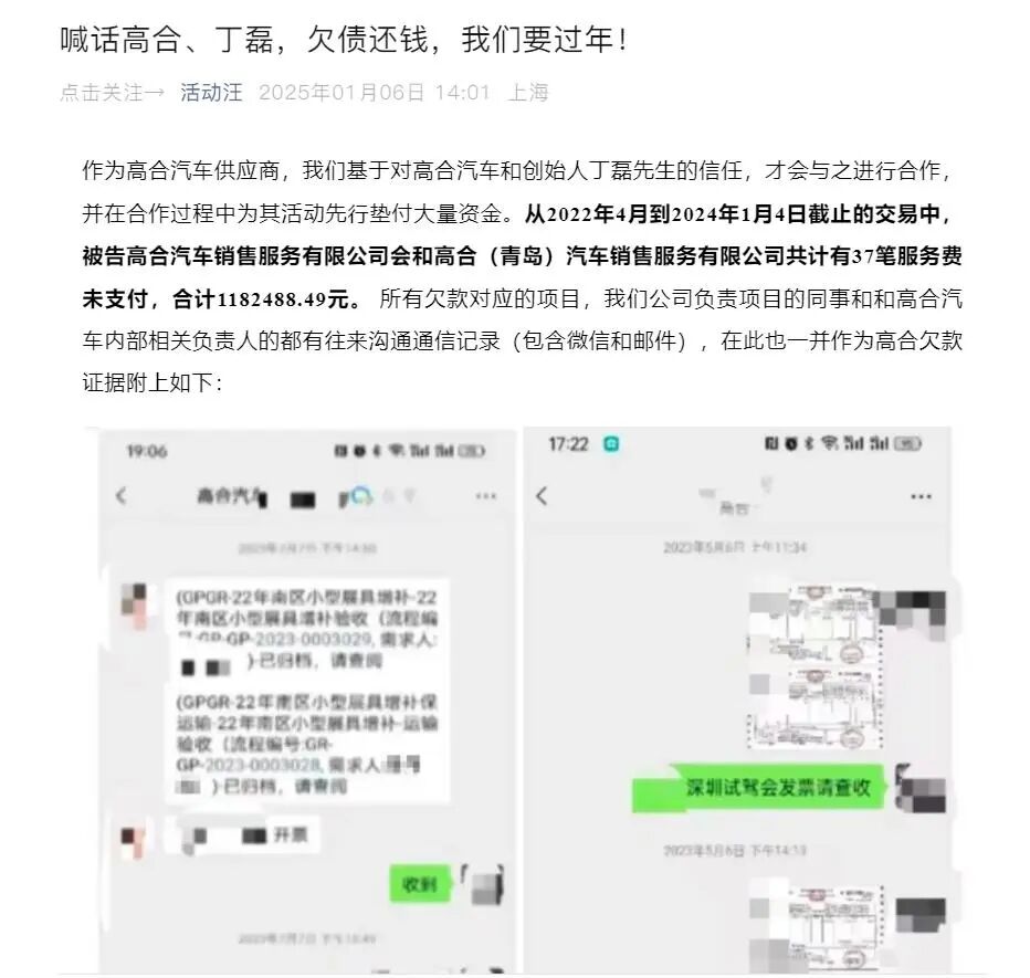 近期,有高合汽车供应商发文,喊话高合汽车和高合汽车创始人丁磊,讨要欠款。该供应商称,其基于对高合汽车和创始人丁磊的信任,才会与之进行合作,并在合作过程中为其活动先行垫付大量资金。从2022年4月到2024年1月4日截止的交易中,被告高合汽车销售服务有限公司会和高合(青岛)汽车销售服务有限公司共计有37笔服务费未支付,合计1182488.49元。nR7拜客生活常识网