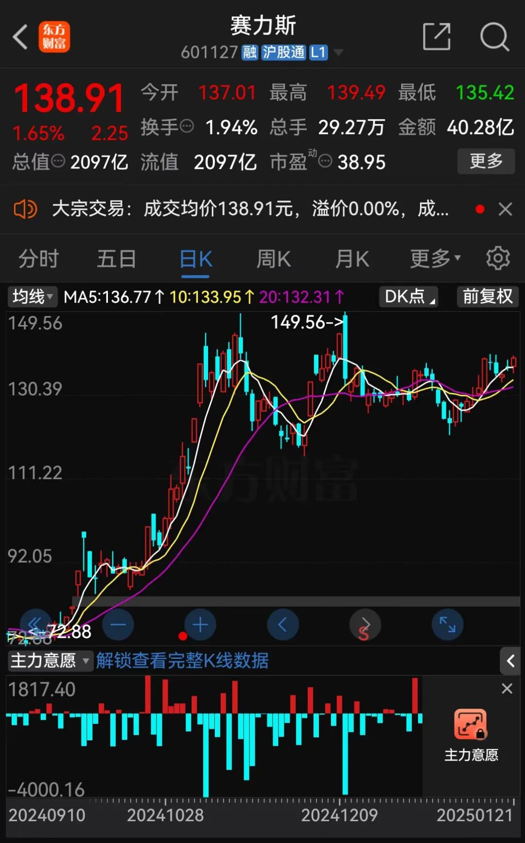 来源:赛力斯2023年年报 截至1月21日收盘,赛力斯股价报138.91元/股,总市值为2097亿元。