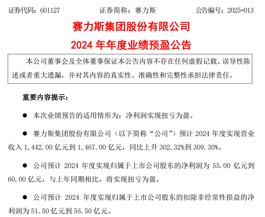 赛力斯拟发行股份购买重庆两江新区龙盛新能源科技有限责任公司(以下简称龙盛新能源)100%股权,构成重大资产重组。此前,赛力斯租赁龙盛新能源的超级工厂生产问界系列车型。 记者注意到,自赛力斯官宣筹划上述交易到获得监管部门审议通过,监管部门一直关注该笔交易的商业合理性。 同日晚间,赛力斯发布业绩预告显示,公司超额完成2024年度经营目标,预计2024年归母净利润为55亿元至60亿元,扣非后净利润为51.50亿元至56.50亿元,均同比实现扭亏为盈。