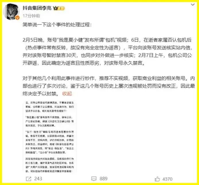 抖音集团副总裁李亮,回应了封禁的原因,解释了事件处理的过程。JHb拜客生活常识网
