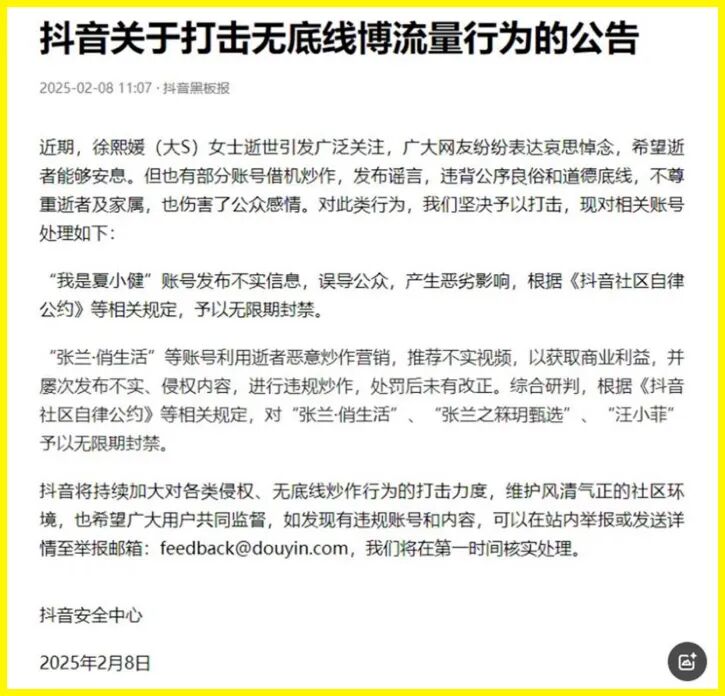 2月5日晚,账号“我是夏小健”发布所谓汪小菲出钱“包机”送大S骨灰的视频。6日,逝者家属否认。2月7日,包机公司公开辟谣,也确定了该账号造谣,将其无限期封禁。
