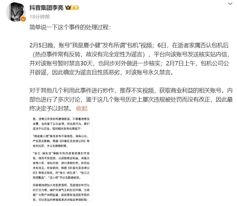 2月8日午间,抖音集团副总裁李亮也就此事在微博发文回应称:2月5日晚,账号“我是夏小健”发布所谓“包机”视频;6日,在逝者家属否认包机后(热点事件常有反转,故没有完全定性为谣言),平台向该账号发送核实站内信,并对该账号暂时禁言30天,也同步对外做进一步核实;2月7日上午,包机公司公开辟谣,因此确定为谣言且性质恶劣,对该账号永久禁言。对于其他几个利用此事件进行炒作,推荐不实视频,获取商业利益的相关账号。内部也进行了多次讨论,鉴于这几个账号历史上屡次违规被处罚而没有改正,因此最终决定予以封禁。