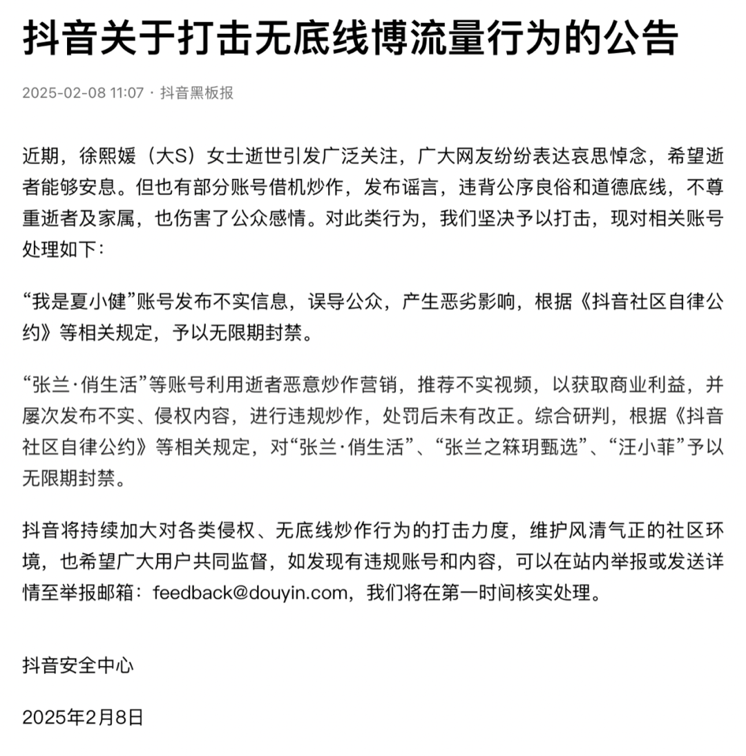 抖音安全中心2月8日公告称,近期,徐熙媛(大S)女士逝世引发广泛关注,广大网友纷纷表达哀思悼念,希望逝者能够安息。但也有部分账号借机炒作,发布谣言,违背公序良俗和道德底线,不尊重逝者及家属,也伤害了公众感情。对此类行为,我们坚决予以打击,现对相关账号处理如下:oQK拜客生活常识网