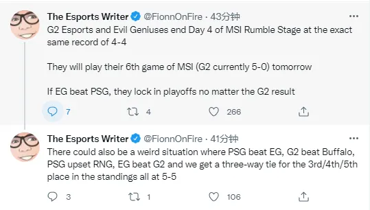 也可能出现一种奇怪的情况,PSG击败EG,G2击败SGB,PSG击败RNG,EG击 G2,G2/EG/PSG在积分榜上会以5-5并列第3/4/5位。”