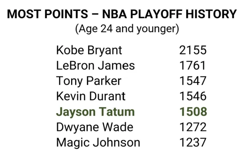 至此,不满25岁的塔特姆职业生涯至今已经在季后赛得到1508分,排在联盟25岁以下季后赛得分榜第五位,之前四人分别是科比-布莱恩特、勒布朗-詹姆斯、托尼-帕克和凯文-杜兰特。