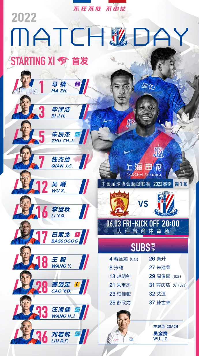 申花首发:1-马镇、3-毕津浩、5-朱辰杰(U23)、16-李运秋、7-钱杰给、12-吴曦、18-王毅、28-曹赟定、33-汪海健(U23)、17-巴索戈、36-刘若钒(U23)