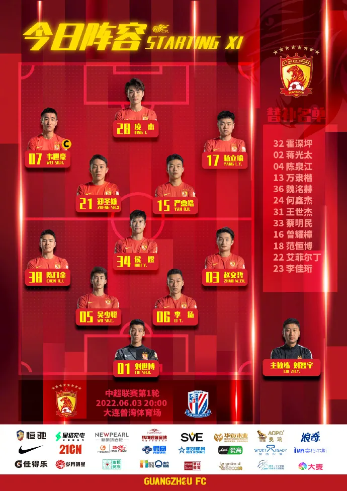 06月03日讯 北京时间6月3日晚20:00,新赛季中超联赛第一轮广州队将对阵上海申花。赛前,双方的首发阵容已经出炉。