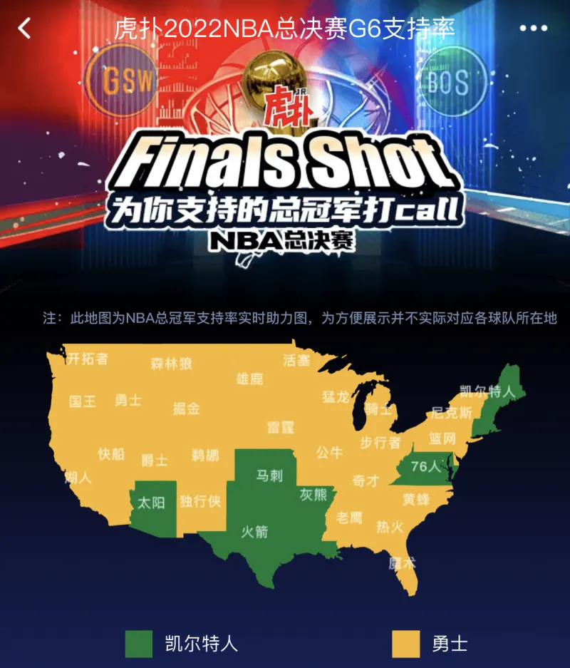 06月14日讯 2022NBA总决赛地图支持率活动进行中,今天勇士主场104-94战胜凯尔特人,攻下天王山,系列赛大比分3-2领先。在今天下午,地图完成了数据清零与更新,目前正在进行的是2022NBA总决赛G6支持率。