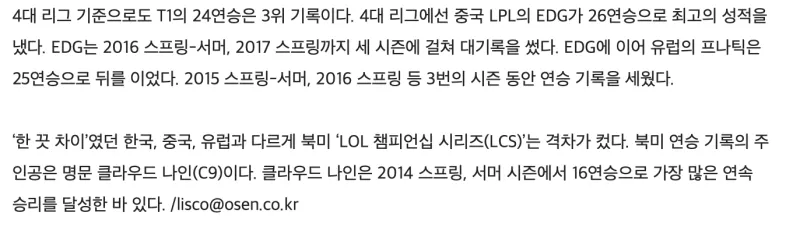 06月30日讯 昨日,T1输给KDF,止步24连胜的LCK最长连胜纪录,赛后韩媒OSEN整理了其他赛区的最长连胜纪录,具体内容如下: