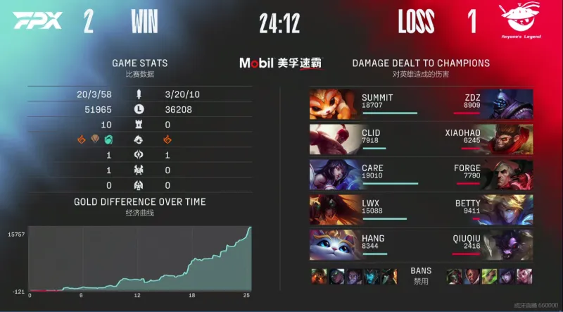 23分钟,AL全力将战争女神秒掉,但后续团战AL溃败,FPX一波终结比赛。