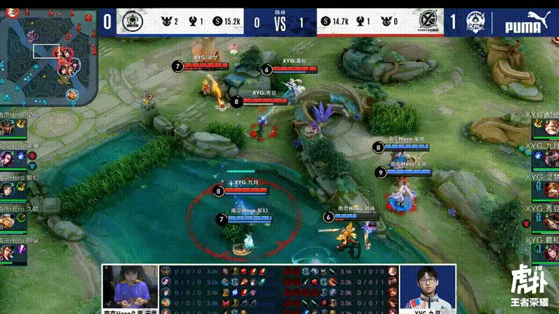 5分50秒,九月兰陵王先手配合灵梦沈梦溪瞬秒紫幻西施,随后久酷后羿大招箭中马可波罗,奈何伤害不足未能击杀,随后XYG一拥而上再杀后羿,XYG0换2