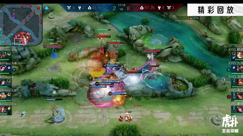 17分20秒,红区团战打响,灵梦沈梦溪找准位置输出爆炸,XYG打出一波2换5