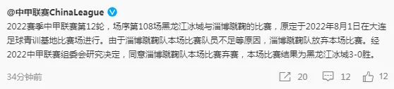 2022赛季中甲联赛第12轮,场序第108场黑龙江冰城与淄博蹴鞠的比赛,原定于2022年8月1日在大连足球青训基地比赛场进行。由于淄博蹴鞠队本场比赛队员不足等原因,淄博蹴鞠队放弃本场比赛。经2022中甲联赛组委会研究决定,同意淄博蹴鞠队本场比赛弃赛,本场比赛结果为黑龙江冰城3-0胜。