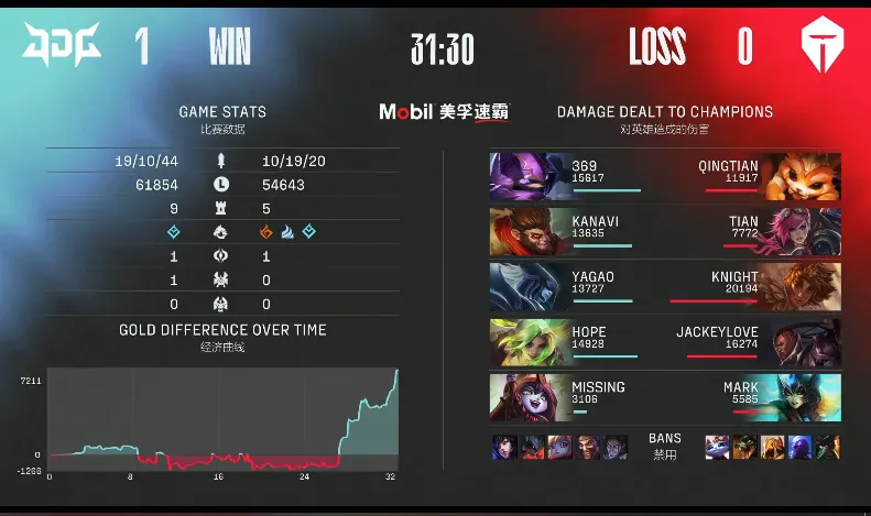 28分钟:蔚想要强开却被直接秒掉,岩雀撤退不及也被收掉,随后JDG强开一波结束比赛