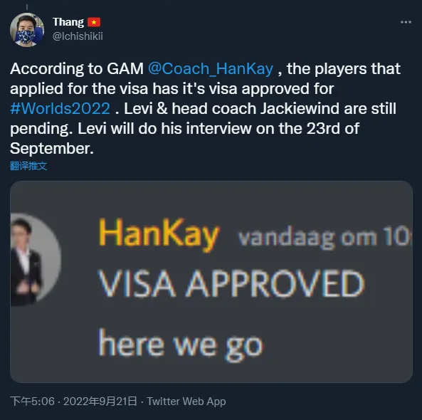 虎扑09月22日讯 GAM官推昨晚宣布申请美国签证的八人中已有六人拿到了签证,可以赴美参加2022LOL全球总决赛的比赛。但并未公布人员明细。