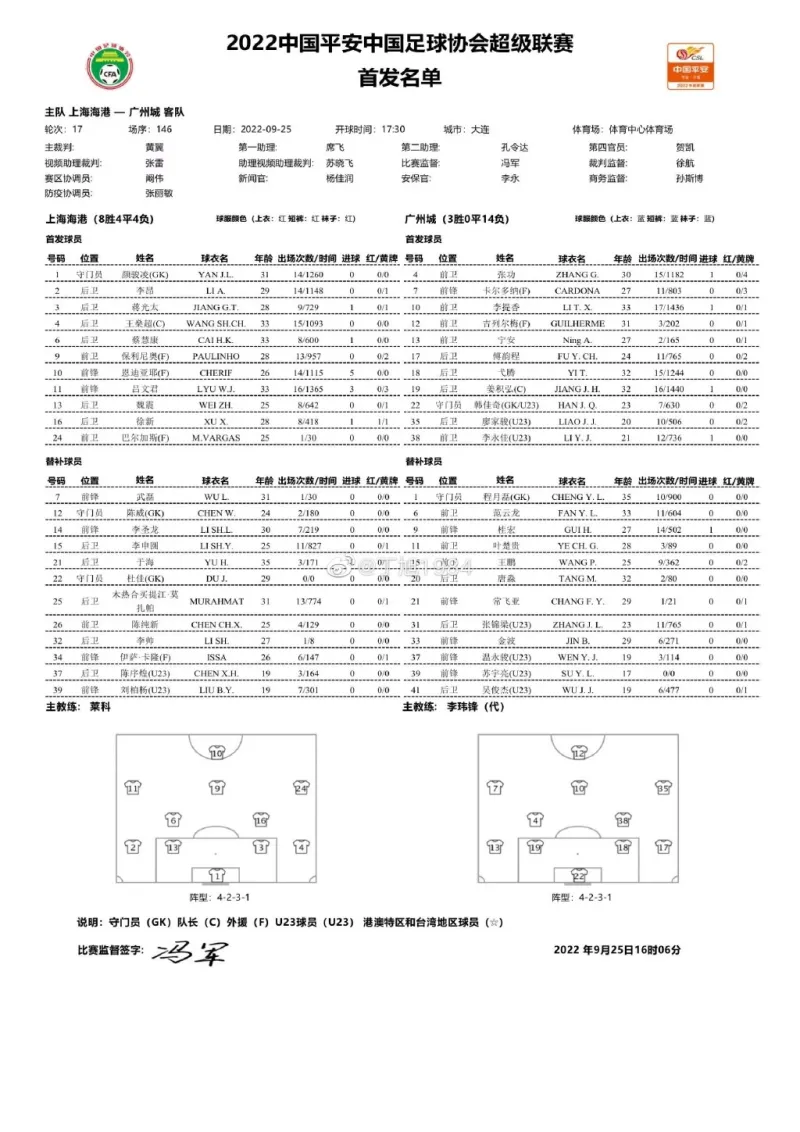 虎扑09月25日讯 北京时间今晚17:30,中超联赛第17轮,上海海港在大连体育中心对阵广州城。赛前,双方公布了首发阵容。