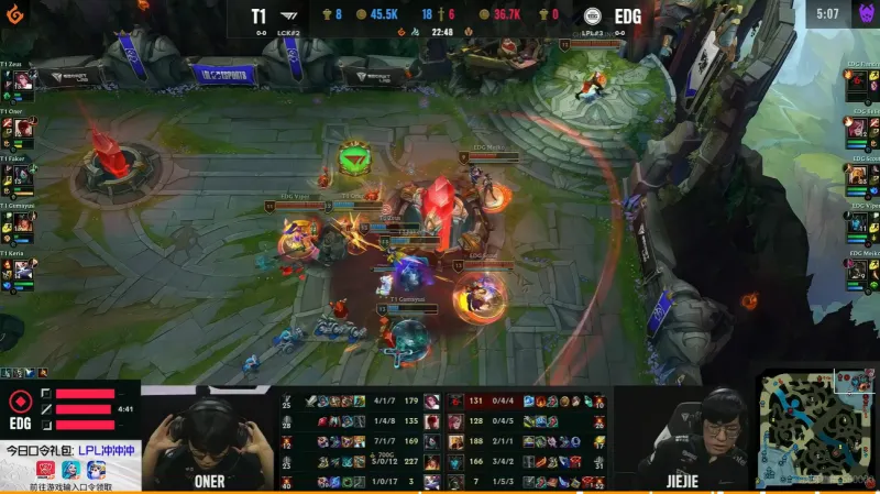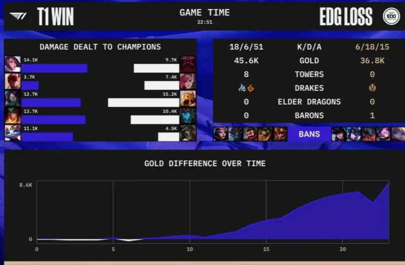 22分钟,EDG拿下大龙,但T1将其团灭,T1高歌猛进一波终结比赛。