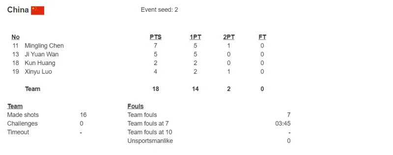 中国女队数据:陈明伶7分、万济圆5分、罗欣棫4分、黄琨2分。