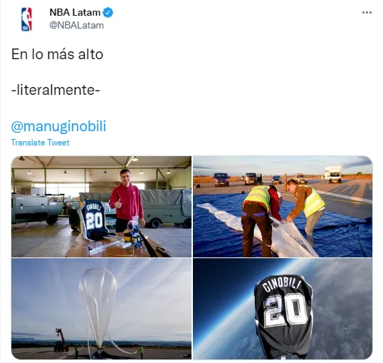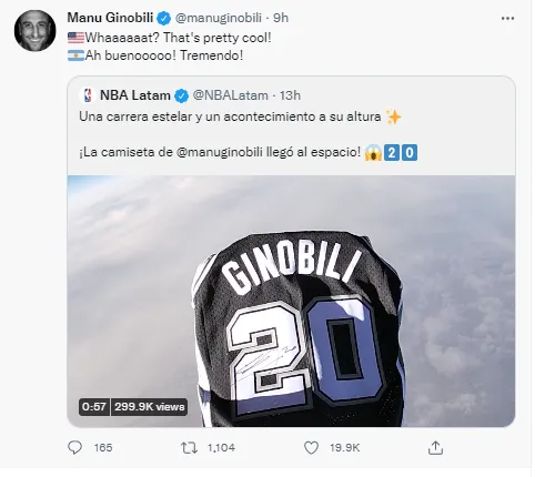 NBA拉丁美洲市场营销主管、副总裁杜阿尔特在一份公开声明中表示:“我们决定将吉诺比利的球衣送上太空,用这种有意义的方式感谢他为拉丁美洲的篮球运动和世界体育所做出的卓越贡献。马努今年成功入选名人堂,这足以证明他的伟大了。”