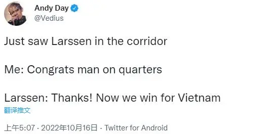 虎扑10月16日讯 在刚刚结束的比赛里,GAM击败TES获得首胜,以下是推特译文(大意):