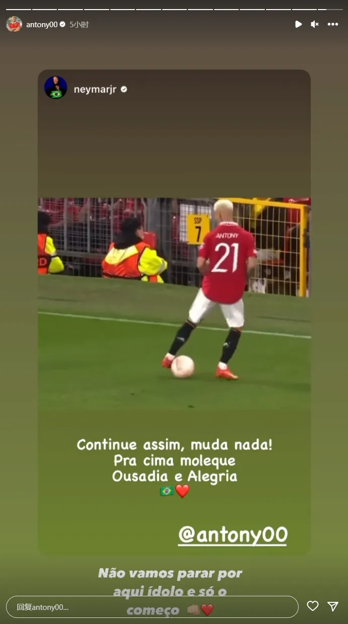 安东尼则转发了内马尔的评论,并写道:“偶像,如果这是一个开始,请让我们不要停止。”
