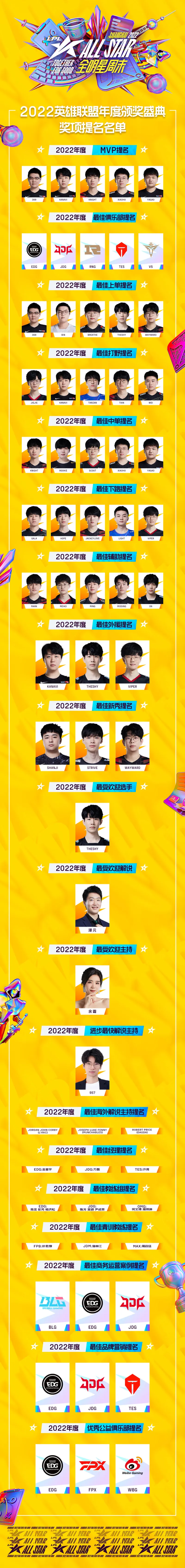2022LPL全明星周末即将开启,在12月10日荣耀日的年度颁奖盛典上,将会颁发2022年度荣誉奖项,以下为各奖项提名名单: