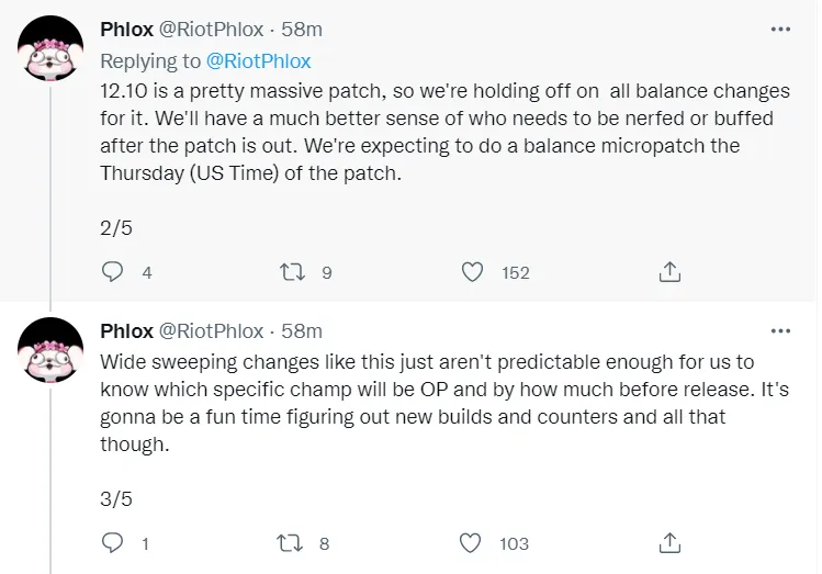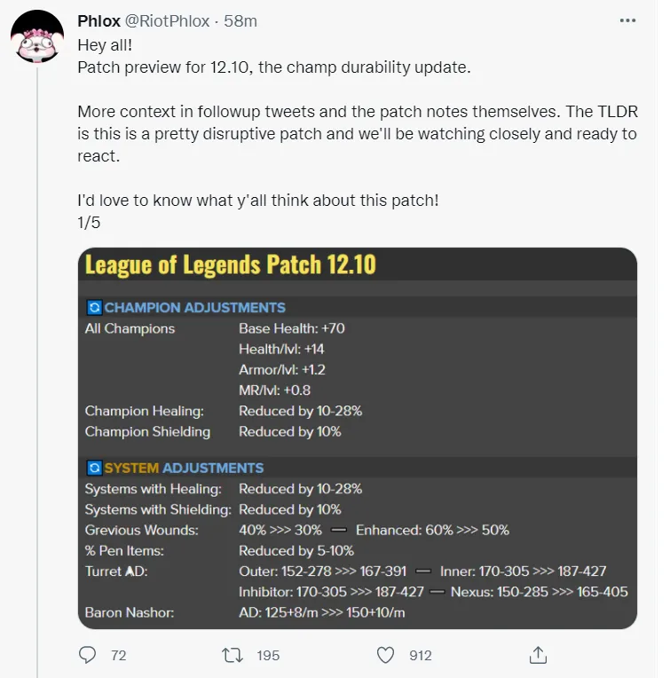 Riot Phlox:“大家好。下面是12.10版本的改动前瞻,关于的是英雄耐久度。