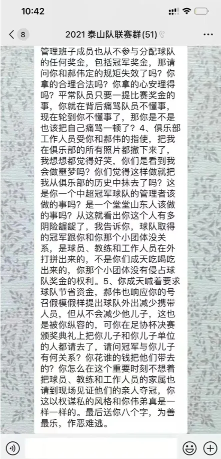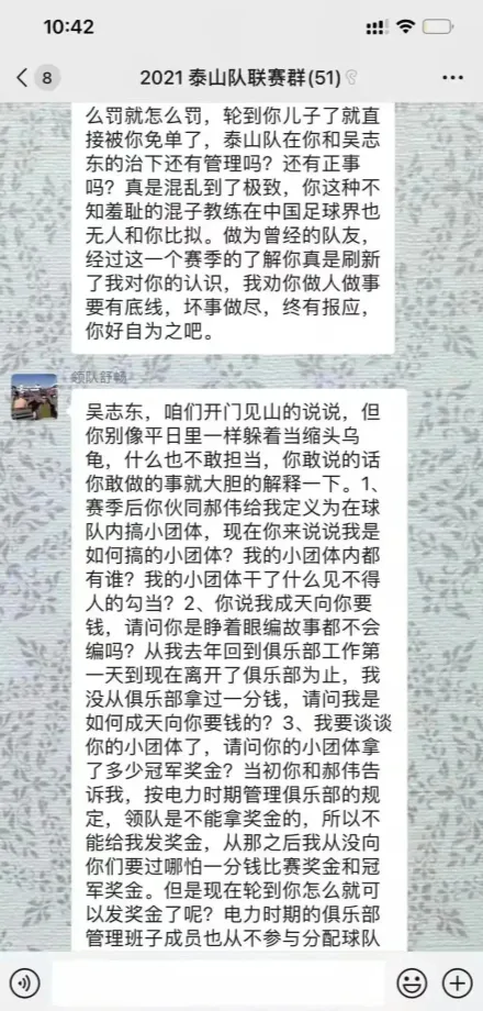 在你儿子的问题上你真是无耻到了几点,你儿子什么水平你没数吗?整个俱乐部所有人恐怕都了解你儿子是个什么水平,预备队里评估都倒数第一,多少比你儿子强的年轻球员都没机会进入一线队,你儿子却堂而皇之占据一个一线队报名名额,对其他的年轻球员公平吗?你儿子平日里多次违反队规,你视而不见装傻充愣。对其他有违纪行为的球员想怎么罚就怎么罚,轮到你儿子了就直接被你免单了,泰山队在你和吴志东的治下还有管理吗?还有正事吗?真是混乱到了极致,你这种不知羞耻的混子教练在中国足球界也无人和你比拟。做为曾经的队友,经过这一个赛季的了解你真是刷新了我对你的认识,我劝你做人做事要有底线,坏事做尽,终有报应,你好自为之吧。”
