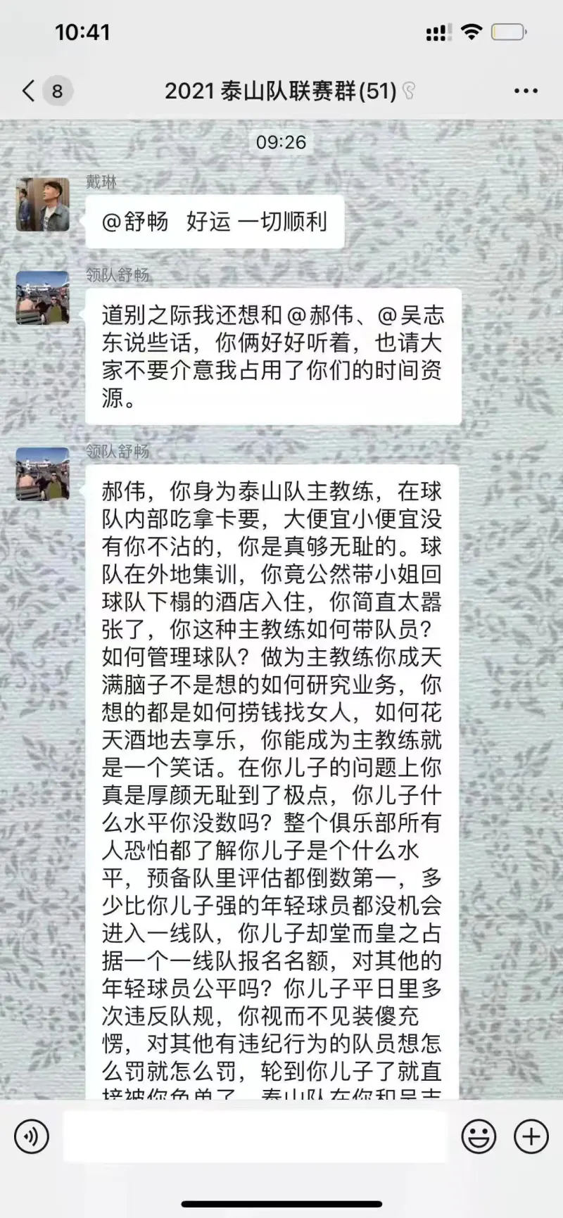 05月17日讯 近日,网上流传一组疑似泰山队群聊截图,泰山领队舒畅怒怼郝伟:作为教练整天想捞钱找女人,厚颜无耻!