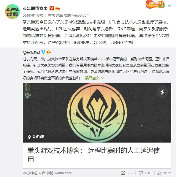 拳头游戏今日发布了关于MSI延迟的技术说明,LPL官方技术人员也进行了复核。近期问题出现时,LPL团队也第一时间与拳头总部、RNG沟通,向拳头反馈俱乐部的诉求并反复协商。后续我们也将会更密切地监测竞赛环境。再次感谢RNG的支持和配合,希望召唤师们继续关注后续比赛,为RNG加油!