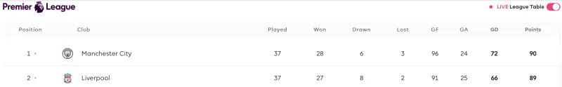 利物浦最后一轮主场对阵狼队,若想夺冠必须取胜且曼城失利或平局。若利物浦战平且曼城失利并丢球数小于6球,同积90分的情况下,曼城则凭借净胜球多的优势夺冠。