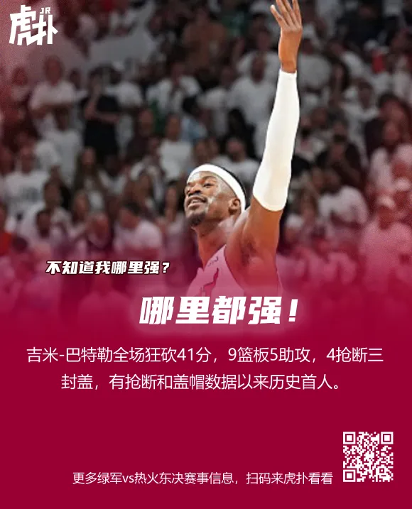 据统计,巴特勒成自1974年有抢断和盖帽统计以来,历史上首位在季后赛单场打出至少41分9篮板5助攻4抢断3封盖的球员。