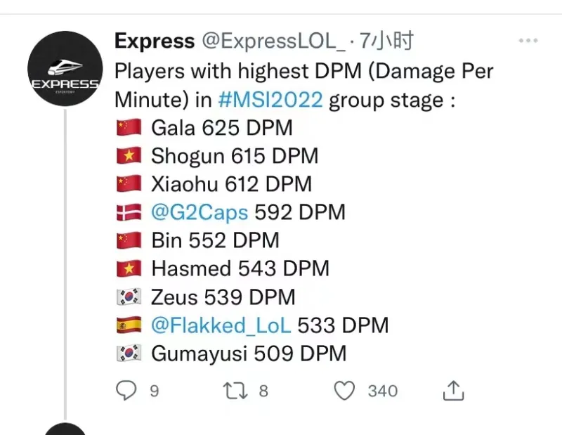 05月18日讯 外媒Express发布小组赛选手的分均伤害排名:GALA以625的分均伤害位列第一,以下为原文: