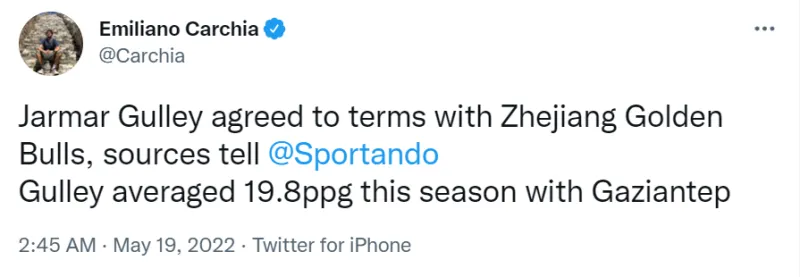 05月19日讯 北京时间今日,据欧洲篮球记者Emiliano Carchia报道,土耳其BSL联赛加济安泰普后卫贾马尔-格利已与浙江队达成签约意向。